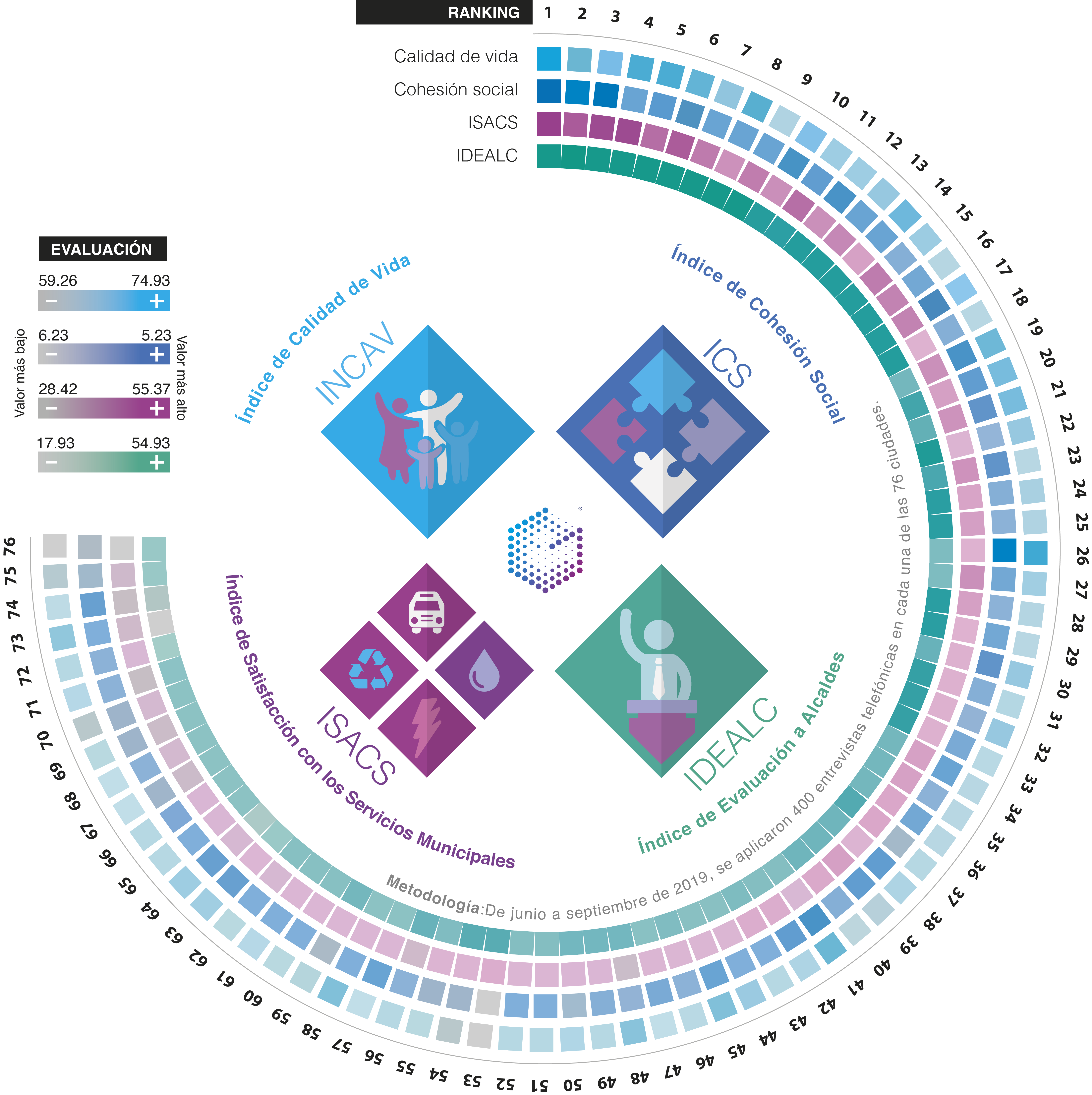 El estudio es una guía comparativa para optimizar la toma de decisiones de acuerdo con las sociales, políticas, económicas y culturales de cada localidad. El instrumento contempla indicadores estandarizados con validez internacional -satisfacción de vida y cohesión social-, lo cual permite realizar comparaciones con otros países. Por otro lado, dentro de nuestro centro de investigación se incluyen indicadores propios para medir las características particulares de nuestra región, cultura y forma de gobierno, así como la evaluación de autoridades locales y servicios. La investigación permite entender los contextos urbanos de manera comparativa al aplicar la misma metodología para todas las ciudades.